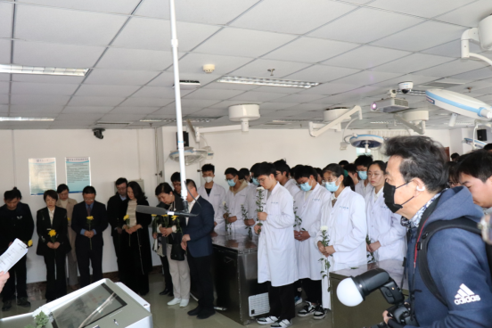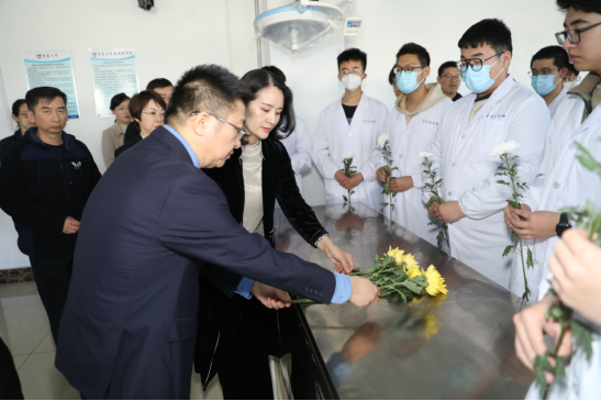 学生代表发言后,人体形态学课程组王双燕老师带领同学们宣读了解剖学誓词。无言良师,授吾医理;敬若先贤,临如活体;正心恭行,追深辨细;德彰术精,修成大医”。铮铮誓言,既是对无言老师的感恩和敬意,更是对医学生们学习奋进的鞭策。现场人员集体向大体老师献花、静默致敬。开课仪式后,与会领导和嘉宾参观了青岛大学医学发展史馆、人体生命科学馆,并围绕“生命·礼赞”缅怀纪念无语良师举行了座谈会。