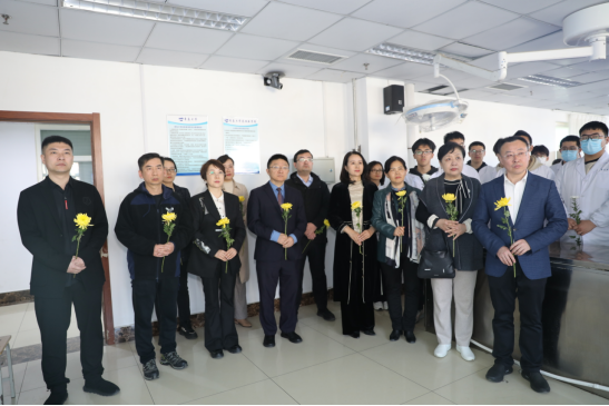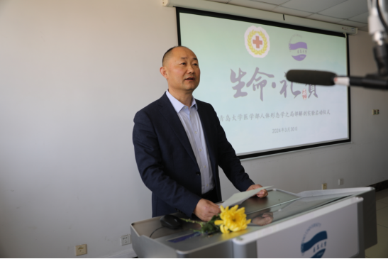2024年3月30日下午,青岛大学基础医学院与青岛市红十字会在医学教育综合楼b座三楼人体形态学实验室内庄重举行了“生命·礼赞”缅怀纪念无语良师暨人体形态学之局部解剖实验启动仪式。青岛市红十字会党组书记、主持工作副会长高嵘,党组成员、副会长马靖坤,事业发展部副部长薛梅,市政协常委陈小艳、魏鲁华、王勇杰,市政协委员马莉娜、宿磊、董方、李晓玲,市政协社会和法制工作办公室社会和法制处处长赵绍贤,青岛大学医学部党委常务副书记王有全,器官捐献与移植研究院院长蔡金贞,基础医学院党委书记丛红群,医学部副部长、基础医学院副院长(主持工作)张蓓,副院长李尚勇,院长助理徐华敏,人体解剖与组织胚胎学系主任金利新,人体形态学实验室、遗体捐献接受中心主任沈若武,人体形态学课程组全体教师、2023级临床医学5 3专业180余名学生,身着白大衣,手持白菊花,庄重举行了局部解剖实验开课仪式。仪式由丛红群主持。