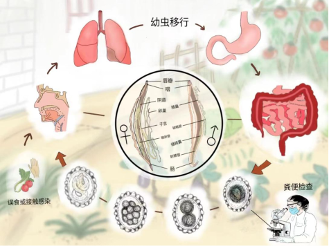 成虫雌雄同体,背腹扁平,虫体大小一般为12mm。成虫寄生于人或哺乳动物的胆管内。虫卵随胆汁进入消化道混于粪便排出,虫卵形似芝麻,淡黄褐色,一端较窄且有盖,卵盖周围的卵壳增厚形成肩峰,另一端有小瘤。卵甚小,长经有20μm左右。从粪便中排出时,卵内已含有毛蚴。虫卵在水中被第一中间宿主淡水螺吞食后,在螺体消化道孵出毛蚴,经历了胞蚴、雷蚴和尾蚴3个阶段。成熟的尾蚴从螺体逸出,遇到第二中间宿主淡水鱼类,则侵入鱼体内肌肉等组织发育为囊蚴。终宿主因食入含有囊蚴的鱼而被感染。以此图来警示人们注意个人饮食卫生,杜绝食用未熟的淡水鱼虾。