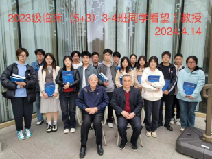 2024年4月14日上午,人体解剖与组织胚胎学系金利新老师带领2023级临床(5 3)一体化专业部分同学看望94岁的丁士海教授。丁教授对同学们的到来表示衷心的感谢,并与同学们分享了自己的求学成长之路,介绍了学校及解剖学科发展历史,解答了同学们的疑问,并勉励同学们珍惜学校提供的优越学习环境,刻苦学习、勇于实践探索。