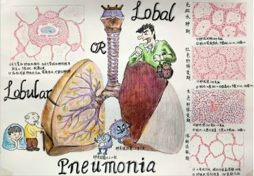 (手绘作品:《大叶性肺炎的病因与防治》、作者:21级临床医学专业 凌紫晨、指导老师:谭晓华)