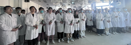 王双燕老师带领同学们宣读了解剖学誓词。铮铮誓言,既是对无语老师的感恩和敬意,更是对医学生们学习奋进的鞭策和激励。伴随着肃穆的音乐,老师和同学们手捧菊花,满怀感恩与敬畏之心,庄重地向“无语良师”们敬献鲜花,静默悼念,以表达对他们深深的敬意和无尽的感恩。
