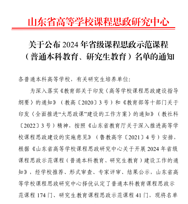 近日,山东省高等学校课程思政研究中心公布了2024年省级课程思政示范课程名单,我校共8门课程获批立项,其中基础医学院李玲教授为课程负责人的《组织与胚胎学i》课程获评2024年省级课程思政示范课(普通本科教育)。至此,基础医学院共获批5门省级课程思政示范课程。