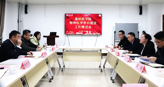 基础医学院党委书记亓慧主持会议,基础医学院副院长、特种医学学科负责人狄国虎从学科现状与建设成效、建设目标与差距、建设思路与举措、目前困难四个方面详细汇报了特种医学学科发展情况。