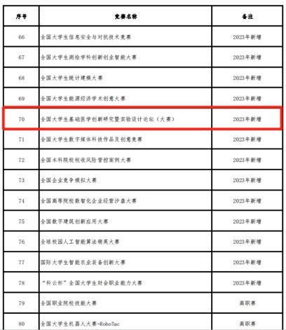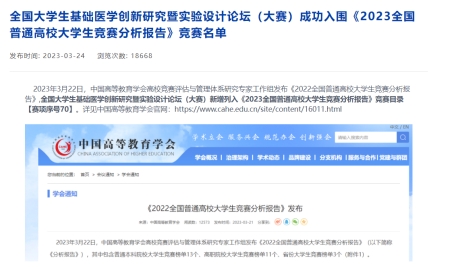 全国大学生基础医学创新研究暨实验设计论坛(大赛)新增列入《2023全国普通高校大学生竞赛分析报告》竞赛目录【赛项序号70】。2024年东部赛区复赛(省赛)将于6月8-9日在我校青岛大学举办,请大家积极踊跃报名参加初赛,通过选拔后即可参加在本校举办的复赛。预祝我校师生在本届比赛中获得更加优异的成绩!