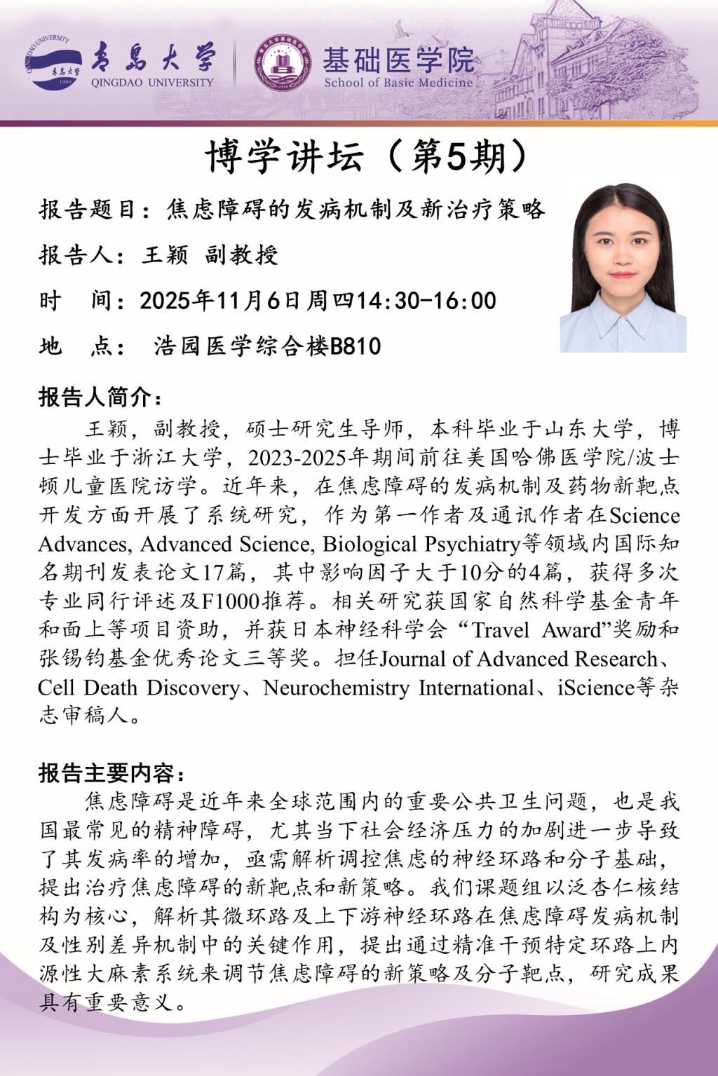 为营造浓厚学术氛围,搭建跨领域、跨学科的学术交流桥梁,全面提升研究生科研素养与实践能力,基础医学院自本学期起定期举办“博学讲坛”系列讲座,特邀校内外优秀学者开展高水平学术报告。11月6日,本次讲坛特邀青岛大学基础医学院生理学专业导师王颖副教授担任主讲人,基础医学院党委书记亓慧出席活动,院长助理徐华敏主持,共有四十余名神经科学相关专业的师生到场参与。