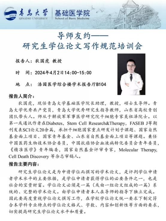 2024年4月2日下午,基础医学院在浩园医学综合楼学术报告厅b104举行了研究生学位论文写作规范培训会。会议在腾讯会议平台同步线上直播。基础医学院院长助理狄国虎教授做了《学位论文写作规范与学术诚信》专题培训。基础医学院副院长陈文芳教授主持了培训会,党委副书记章敏、辅导员李慧丽、导师代表以及140名2024届毕业生参加了培训会。
