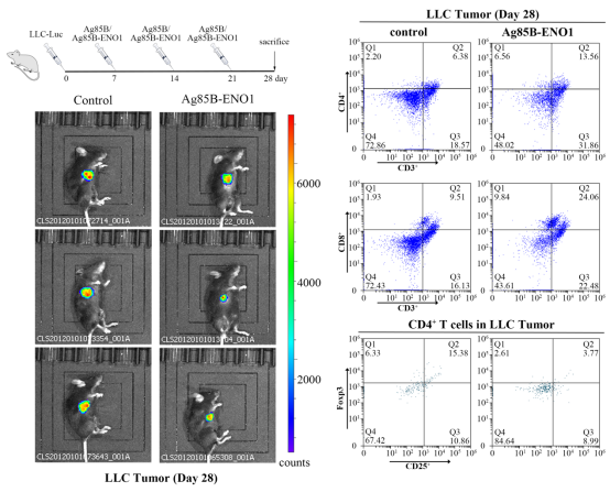 肺癌是发病率和死亡率最高的癌症之一。然而,传统癌症治疗的效果是有限的。本研究设计了一种基于肿瘤相关抗原meno1的治疗性癌症疫苗,通过对小鼠皮下肿瘤模型的治疗发现,ag85b-eno146-82疫苗增强了肿瘤中cd4 t和cd8t细胞的浸润,增加cd8 t淋巴细胞分泌ifn-γ和tnf-α,并促进巨噬细胞向m1表型极化。本研究为通过使用治疗性肿瘤相关抗原多肽疫苗治疗小鼠肺癌提供了重要的理论和实验依据。