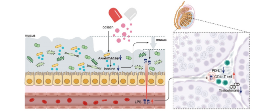 团队前期研究发现,窄谱抗生素粘菌素可以通过下调雄性小鼠的睾酮水平,显著提高抗pd-l1的抗肿瘤效率。然而,粘杆菌素调节睾酮的潜在机制尚未被研究。本研究发现粘菌素可以显著下调睾丸中pd-l1的表达,增强cd4 t细胞的浸润,表明粘杆菌素对睾丸免疫抑制微环境产生影响。进一步的研究发现,粘菌素可以相对选择性地降低akkermansia的丰度,并减少肌苷的产生。口服补充肌苷可以减轻粘菌素引起的结肠黏液层厚度的改变,恢复正常的血清lps水平。此外,肌苷补充可促进睾丸中pd-l1表达和睾酮分泌的恢复。本研究发现揭示了肠道菌群调节宿主睾酮分泌的新途径。