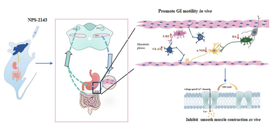 钙敏感受体(calcium-sensing receptor, casr)广泛表达于胃肠道肌间神经丛,参与调节胃肠道运动。帕金森病(pd)的前驱胃肠道功能障碍严重影响老年人生活质量。因此,寻找改善pd患者胃肠道功能障碍的有效药物具有重要意义。该研究在体实验发现口服casr负变构调节剂nps-2143可改善mptp诱导的pd小鼠胃肠道动力障碍,这种作用可能与其调节肠神经系统神经递质合成和神经元可塑性有关。此外,nps-2143还影响脑干孤束核和迷走运动背核的神经元信号,提示中枢神经系统也参与了nps-2143的作用。离体结果显示,nps-2143抑制了胃窦和结肠肌条的收缩活动,该作用和其对电压门控钙通道的直接抑制有关。我们的研究为揭示casr在pd发病中的调节作用提供了实验依据,为临床pd患者胃轻瘫和便秘等胃肠功能紊乱的治疗提供了新的研究方向。
