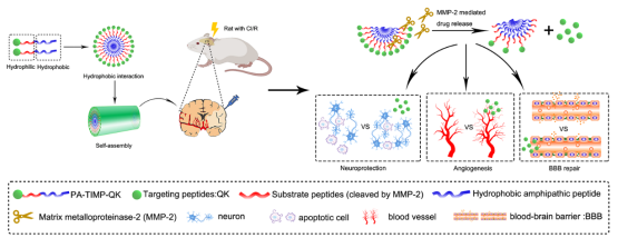 缺血性脑卒中是严重威胁着人类健康的疾病,及时的血管再通是临床有效的治疗方法。近年来,再生医学策略如干细胞、生长因子在缺血性脑卒中的治疗中显示出良好的应用前景。 其中,血管内皮生长因子(vascular endothelial growth factor, vegf)是最重要的促血管形成因子。然而,研究表明在缺血性脑卒中的治疗,vegf的早期给药(<缺血后24小时)具有增加血脑屏障通透性的风险。如何控制vegf的释放是限制其在缺血性脑卒中治疗的重要问题。基于基质金属蛋白酶-2(mmp-2)在脑缺血后逐步上调的特性,设计构建pa-timp-qk纳米自组装多肽水凝胶。该pa-timp-qk水凝胶可响应mmp-2的变化控制血管生成肽qk的释放,且不影响qk的生物学活性。当pa-timp-qk纳米自组装多肽水凝胶移植到大鼠缺血脑缺血组织部位,可实现响应损伤微环境中mmp-2的上调缓释qk,由此促进神经元存活、重建局部血运循环,减少血脑屏障通透性,并最终有效恢复缺血性脑卒中大鼠的运动行为功能。该研究为脑缺血的靶向治疗提供了具有应用潜力的新策略。