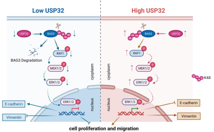 近日,遗传学与细胞生物学系李冰课题组在《oncogenesis》(if=5.9,中科院2区)发表题目为“usp32 facilitates non-small cell lung cancer progression via deubiquitinating bag3 and activating raf-mek-erk signaling pathway”的研究论文(doi:10.1038/s41389-024-00528-z)。基础医学院2021级硕士研究生李双、杨丽娜副教授为论文第一作者,刘春艳副教授、李冰教授为论文通讯作者,青岛大学基础医学院为第一单位。该研究受到国家自然科学基金(81871231、81802759)和中国博士后科学基金(2019m652312)资助。