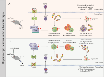 帕金森病是多发于中老年人的神经系统退行性疾病。本课题组前期研究发现,外源性给予ghrelin可通过激活生长激素促分泌素受体(ghsr)在帕金森病中发挥神经保护作用。在本研究中,我们观察到ghsr敲除后能够加剧mptp诱导的帕金森病小鼠模型黑质多巴胺能神经元损伤。具体机制表现为ghsr敲除可增加klf4的表达,进而转录调节mtorc1的deptor亚基,导致自噬的持续激活和溶酶体功能障碍,从而抑制受损线粒体的清除。同时,敲低klf4后可有效逆转上述过程,抑制黑质多巴胺能神经元损伤。本研究阐明了内源性ghsr在维持多巴胺能神经元功能中的重要作用,为帕金森病的治疗提供了新的靶点和实验依据。
