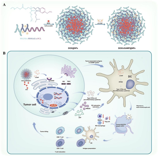 阿霉素(dox)可诱导免疫原性细胞死亡(icd),导致肿瘤相关分子模式(damps)和肿瘤相关抗原的释放。这一过程可促进树突状细胞(dcs)成熟和细胞毒性t淋巴细胞浸润。但是癌细胞可通过多种机制来逃避宿主免疫系统。最近的研究表明,干扰素基因激动剂,如cgamp,可以放大icd触发的免疫应答,增强免疫细胞浸润。因此构建了dox和cgamp共递送系统(dox/cgamp@ nps)治疗黑色素瘤和三阴性乳腺癌。结果表明,dox能有效地杀伤肿瘤细胞,并通过icd诱导damps的释放。体内结果表明cgamp可通过诱导i型干扰素和促炎细胞因子的分泌,促进dcs的成熟和cd 8 t细胞的活化和浸润,增强dox诱导的抗肿瘤免疫应答,还有效缓解免疫抑制性肿瘤微环境。该研究证明了联合dox和cgamp的策略对未来的研究和临床应用具有重要意义。