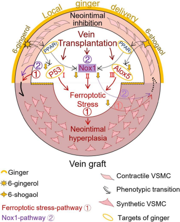 移植静脉血管重构是“搭桥”患者术后常面临的主要难题,也是心血管医疗体系最重的负担之一。中医药治疗作为一种补充和替代疗法一直备受世界青睐,课题组通过构建小鼠静脉移植术后两月血管模型,模拟冠状动脉旁路移植术患者术后长期时间点的恢复情况,发现传统中医药物生姜的醇提物可以通过靶向p53、alox5及pparr/nox1多靶点多信号通路阻断移植静脉中血管平滑肌细胞表型转化中的铁死亡应激来抑制移植静脉血管重构,促进移植静脉血管的修复。这为阻塞性血管疾病的治疗带来了新的药物靶点。