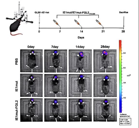 胶质母细胞瘤(gbm)是一种高度恶性的脑肿瘤,具有极强的侵袭性,预后差,患者生存率低。近年来,免疫疗法在多种恶性肿瘤治疗中展现了巨大的潜力,但在gbm中的应用效果依然有限。本研究创新性地利用生物信息学技术预测胶质瘤高表达蛋白fgl2的抗原优势表位,聚焦于fgl2172-220肽与人类巨细胞病毒即刻早期蛋白1突变疫苗(hcmv-ie1mut)的组合应用,利用机体的交叉提呈反应探索其在抑制gbm中的作用机制。研究结果表明,fgl2172-220肽能够显著减少胶 质瘤微环境中关键的免疫抑制细胞,如小胶质细胞、调节性t细胞(tregs)和髓源性抑制细胞(mdscs),增强cd8t等细胞的浸润,从而增强hcmv-ie1mut的抗肿瘤效果,最终实现肿瘤体积的缩小并显著延长实验小鼠的生存期。研究成果不仅丰富了胶质母细胞瘤的免疫治疗策略,也为未来临床研究和治疗方案的设计提供了新的方向和启发。