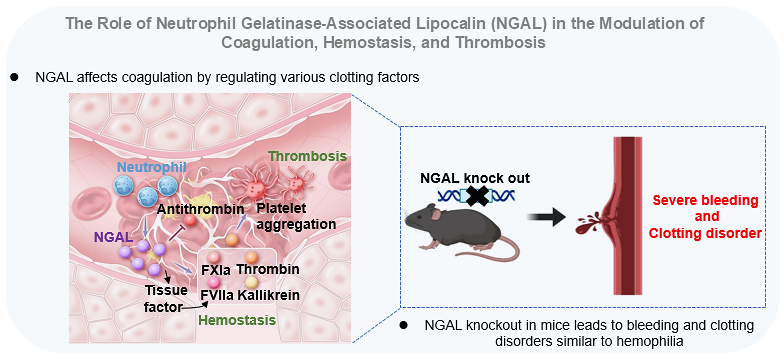凝血与炎症密切相关,但先天免疫系统与凝血调节的关键通路仍不完全清楚。该研究显示,在深静脉血栓患者的血浆中,先天免疫炎症介质中性粒细胞明胶酶相关载脂蛋白(ngal)水平上升。ngal通过增强细胞表面组织因子表达、增强多种凝血因子(如凝血酶、激肽释放酶、fxia和fviia)催化活性、促进凝血酶诱导的血小板聚集以及抑制抗凝血酶来实现其对凝血、止血和血栓形成的启动和放大。在ngal敲除的小鼠中,血栓弹力图谱分析显示凝固和反应时间显著延长,血栓凝固角和最大振幅降低,这与活化部分凝血活酶时间和凝血酶原时间的显著延长相一致。在多种小鼠止血和血栓模型中,ngal过表达或静脉注射促进了凝血和止血,增加了血栓形成,而ngal敲除或使用抗ngal单克隆抗体处理则显著延长了出血时间并减少了血栓形成。值得注意的是,敲除ngal可将小鼠尾部的出血时间或颈动脉闭塞时间延长至40分钟或60分钟以上,类似于血友病小鼠中严重的出血和凝血功能障碍。此外,抗ngal单克隆抗体干预显著减少了由角叉菜胶诱导的小鼠尾部血栓形成,而这一模型与炎症密切相关。