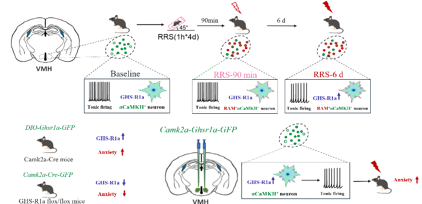 焦虑障碍是全球最常见的精神疾病之一,但其神经机制尚不明确。本研究首次明确了ghs-r1a(生长激素促分泌素受体1a)通过调控下丘脑腹内侧核(vmh)αcamkii 神经元兴奋性参与焦虑行为的发展,提出了ghs-r1a作为治疗焦虑障碍潜在靶点的新概念。未来可基于这一机制开发针对性药物干预策略,尤其是在创伤后应激障碍(ptsd)等疾病中具有重要应用前景。