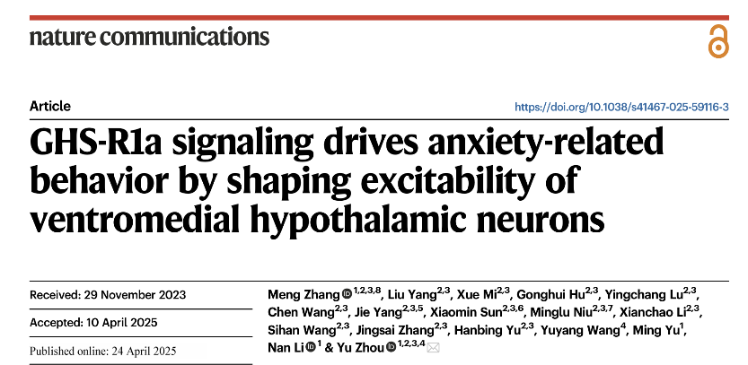 近日,我院生理学专业2020级博士研究生张萌以第一作者在nature communications(if=14.7,中科院1区top)发表题为“ghs-r1a signaling drives anxiety-related behavior by shaping excitability of ventromedial hypothalamic neurons.”的研究论文,我院生理学专业2021级在读博士研究生杨柳和2017级硕士研究生弭雪也对本研究有重要贡献。基础医学院为第二通讯单位。